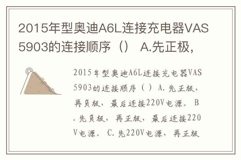 关于2015年型奥迪A6L连接充电器VAS5903的正确顺序,根据通用的汽车电气安全操作规范以及VAS5903这类专业充电设备的设计原理,最安全、最正确的选项是 A. 先正极,再负极,最后连接220V电源。