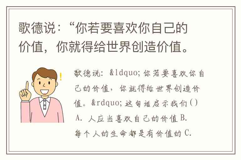 歌德说:“你若要喜欢你自己的价值,你就得给世界创造价值。”这句话启示我们( ) A. 人应当喜欢自己的价值 B. 每个人的生命都是有价值的 C. 肯定生命的重要性 D. 为社会作出贡献,就更能体现自己生命的价值