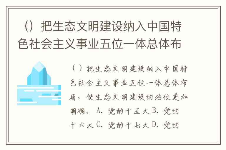()把生态文明建设纳入中国特色社会主义事业五位一体总体布局,使生态文明建设的地位更加明确。 A. 党的十五大 B. 党的十六大 C. 党的十七大 D. 党的