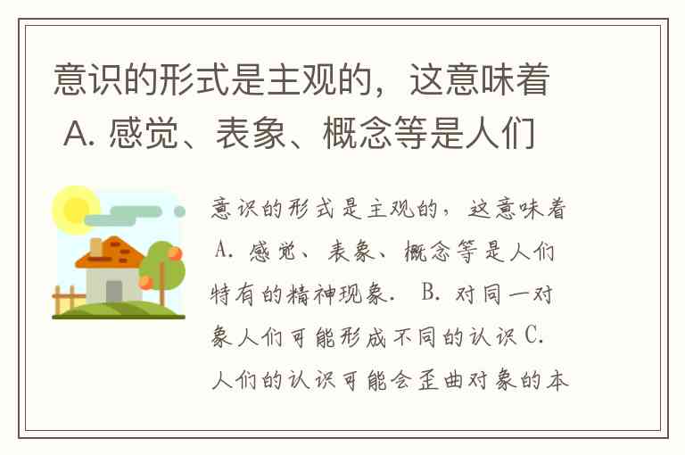 意识的形式是主观的,这意味着 A. 感觉、表象、概念等是人们特有的精神现象. B. 对同一对象人们可能形成不同的认识 C. 人们的认识可能会歪曲对象的本来面目 D. 人们永远认识不了世界的真相
