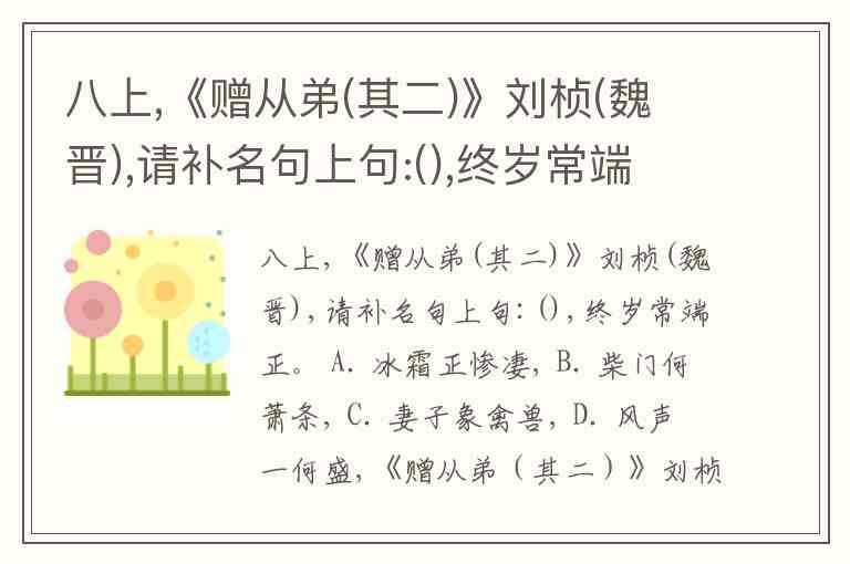 八上,《赠从弟(其二)》刘桢(魏晋),请补名句上句:(),终岁常端正。 A. 冰霜正惨凄, B. 柴门何萧条, C. 妻子象禽兽, D. 风声一何盛,