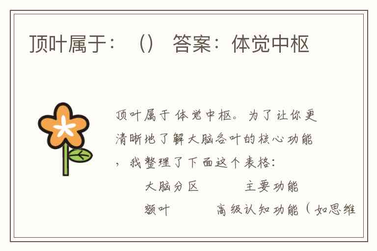| 顶叶 | 躯体感觉(如触觉、压觉、温度觉)、空间感知、数学逻辑 |