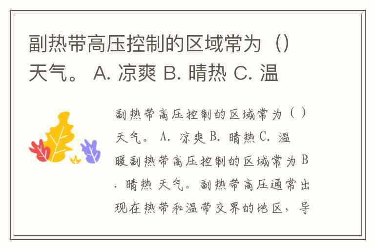 副热带高压控制的区域常为()天气。 A. 凉爽 B. 晴热 C. 温暖