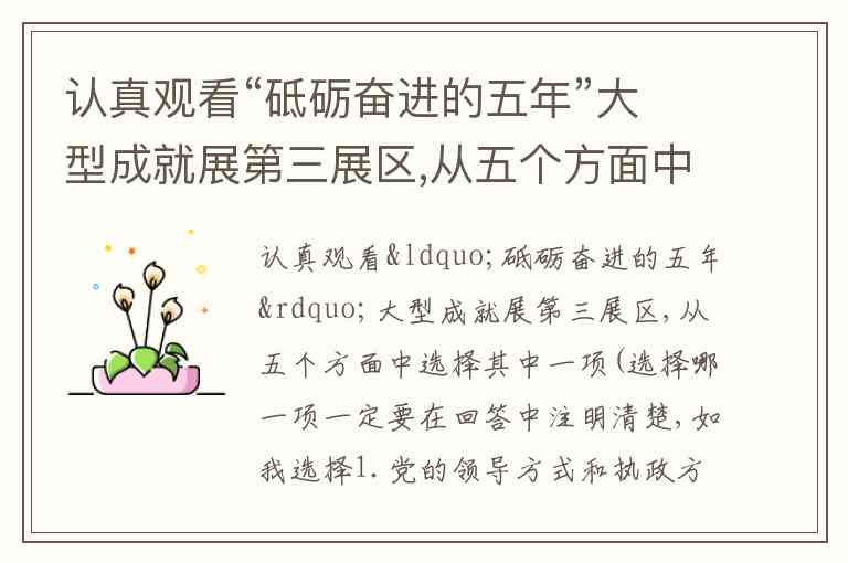 认真观看“砥砺奋进的五年”大型成就展第三展区,从五个方面中选择其中一项(选择哪一项一定要在回答中注明清楚,如我选择1.党的领导方式和执政方式不断改进),具体结合自己的家乡,描述一下这五年家乡在这方面上的变化,需要有图有真相,家乡一定要写详细(如某省某市某县某镇某村某屯某大队)。 具体格式如下:1.我选择的是..........(填哪一项) 2.第三展区主要讲了.......(做简单陈述) 3. 我的家乡在........(具体地点),这五年在XX方面(结合第三展区你选择的那一项内容)有了什么变化(需要数据、图片、事例作支撑)。 4.我希望我的家乡在未来的五年有怎样的发展?(简单谈一下愿景)