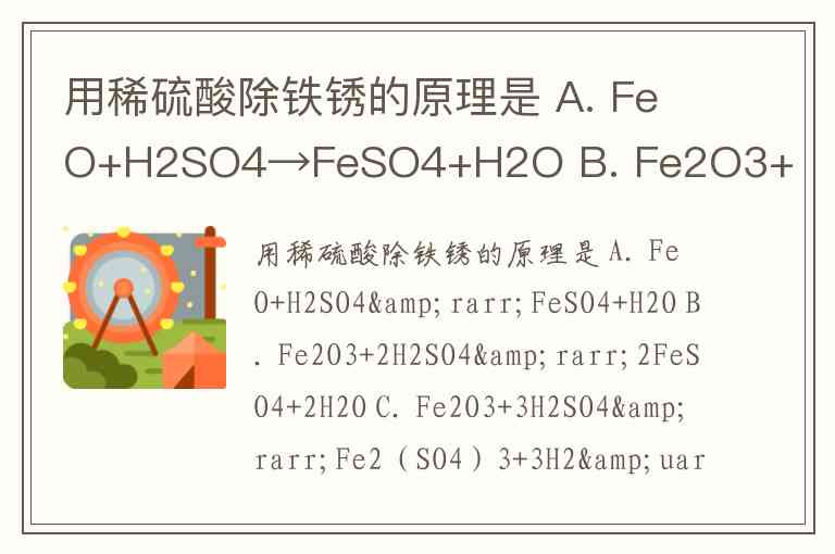 用稀硫酸除铁锈的原理是 A. FeO+H2SO4→FeSO4+H2O B. Fe2O3+2H2SO4→2FeSO4+2H2O C. Fe2O3+3H2SO4→Fe2(SO4)3+3H2↑ D. Fe2O3+3H2SO4→Fe2(SO4)3+3H2O