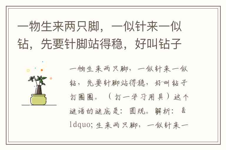 解析: “生来两只脚,一似针来一似钻”:圆规有两只脚,一脚是针尖(固定),一脚是铅笔芯(像钻子画圈)。