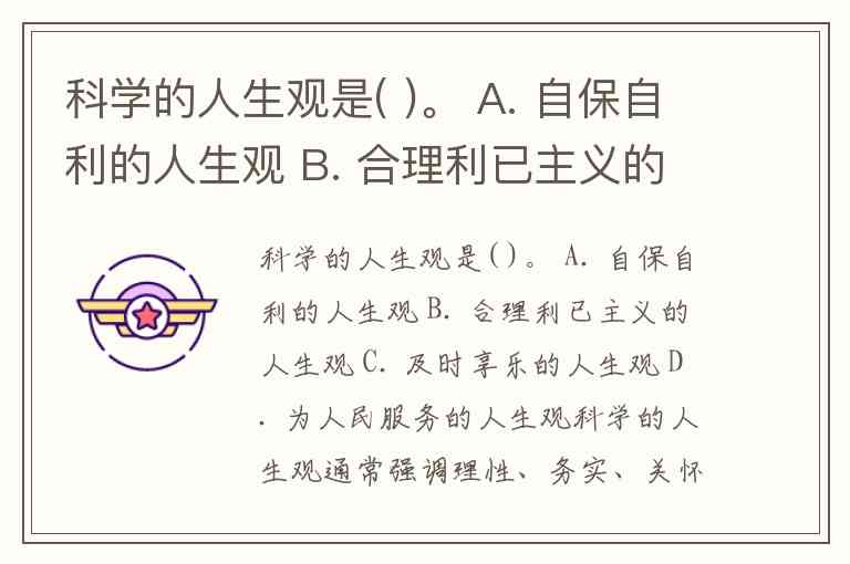 科学的人生观是( )。 A. 自保自利的人生观 B. 合理利已主义的人生观 C. 及时享乐的人生观 D. 为人民服务的人生观