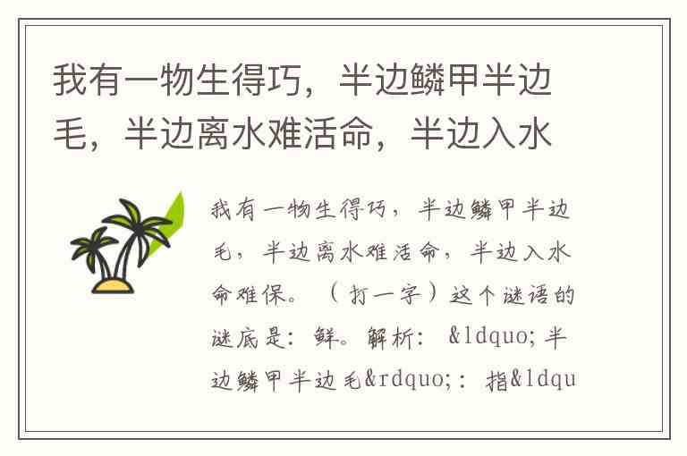 我有一物生得巧,半边鳞甲半边毛,半边离水难活命,半边入水命难保。 (打一字)