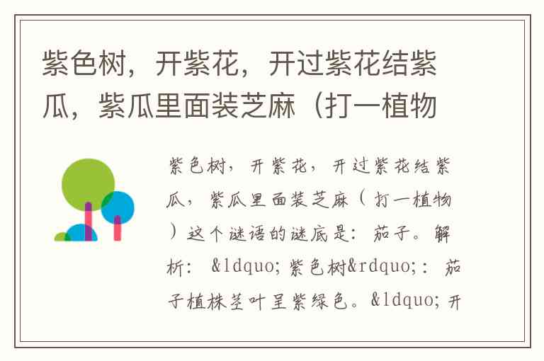 紫色树,开紫花,开过紫花结紫瓜,紫瓜里面装芝麻(打一植物)