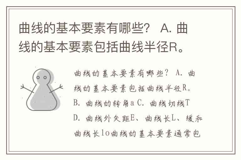 曲线的基本要素有哪些? A. 曲线的基本要素包括曲线半径R。 B. 曲线的转角a C. 曲线切线T D. 曲线外矢距E、曲线长L、缓和曲线长lo