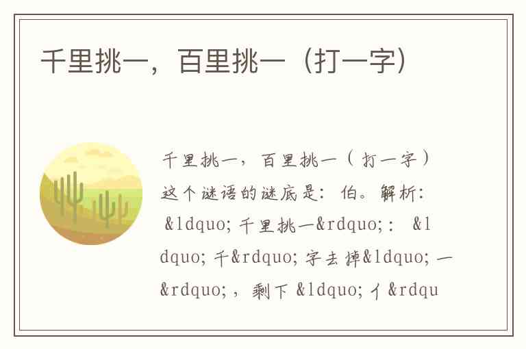 实际常见答案是 “伯”: “千里挑一” 扣“亻”(“千”-“一”=“亻”?不通,但“千”字去掉一横像“亻”), “百里挑一” 扣“白”(“百”-“一”=“白”), “亻” + “白” = “伯”。