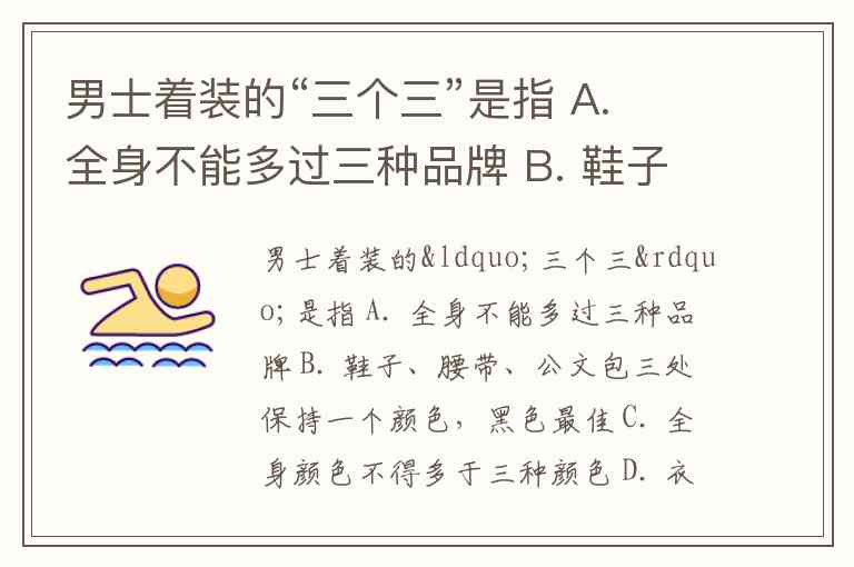这个原则强调男士在穿着上尽量简约,避免过多颜色的搭配。通常,三种颜色以内可以保持着装的协调与优雅。其余选项虽然也有一定的穿着规范,但不属于“男士着装的三个三”原则中的内容。