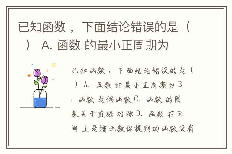 已知函数 ,下面结论错误的是( ) A. 函数 的最小正周期为 B. 函数 是偶函数 C. 函数 的图象关于直线 对称 D. 函数 在区间 上是增函数