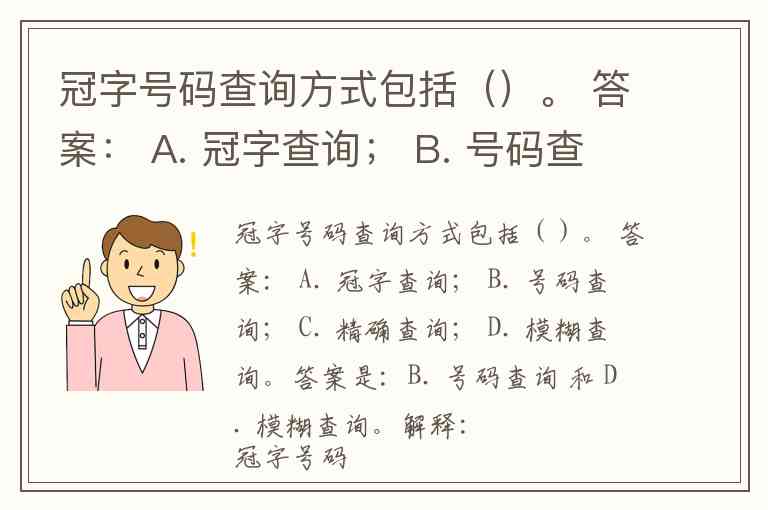 冠字号码查询方式包括()。 答案: A. 冠字查询; B. 号码查询; C. 精确查询; D. 模糊查询。