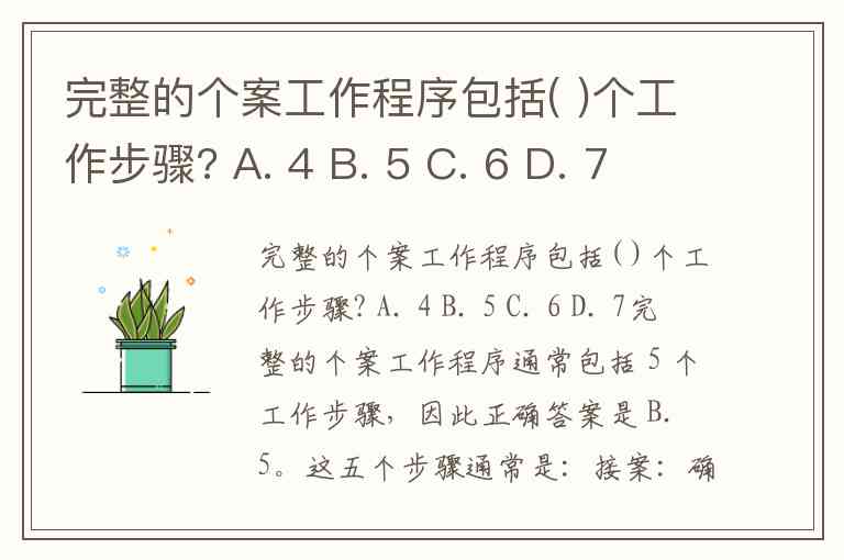 完整的个案工作程序包括( )个工作步骤? A. 4 B. 5 C. 6 D. 7
