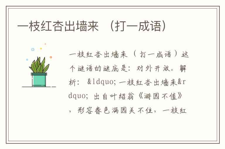 解析: “一枝红杏出墙来” 出自叶绍翁《游园不值》,形容春色满园关不住,一枝红杏探出墙外。