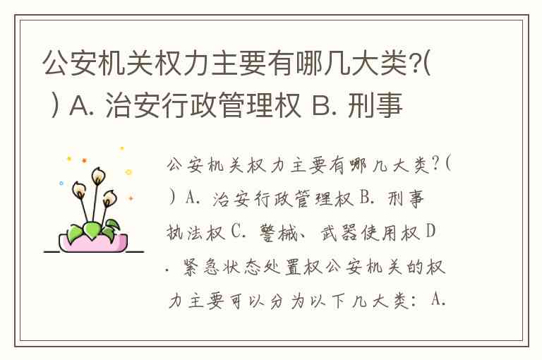 公安机关权力主要有哪几大类?( ) A. 治安行政管理权 B. 刑事执法权 C. 警械、武器使用权 D. 紧急状态处置权