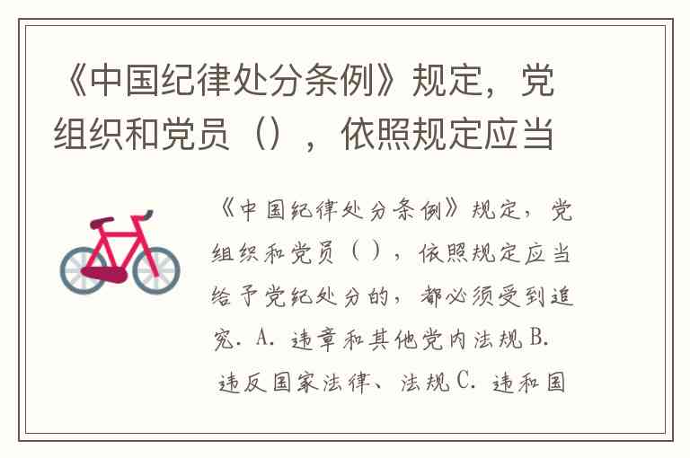 《中国纪律处分条例》规定,党组织和党员(),依照规定应当给予党纪处分的,都必须受到追究. A. 违章和其他党内法规 B. 违反国家法律、法规 C. 违和国家政策、社会主义道德 D. 危害党、国家和人民利益的行为