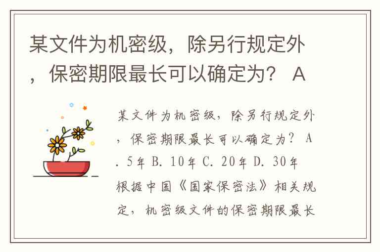 某文件为机密级,除另行规定外,保密期限最长可以确定为? A. 5年 B. 10年 C. 20年 D. 30年