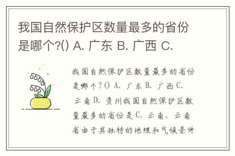 我国自然保护区数量最多的省份是哪个?() A. 广东 B. 广西 C. 云南 D. 贵州