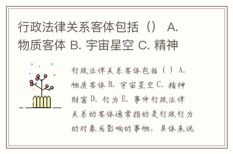 行政法律关系客体包括() A. 物质客体 B. 宇宙星空 C. 精神财富 D. 行为 E. 事件