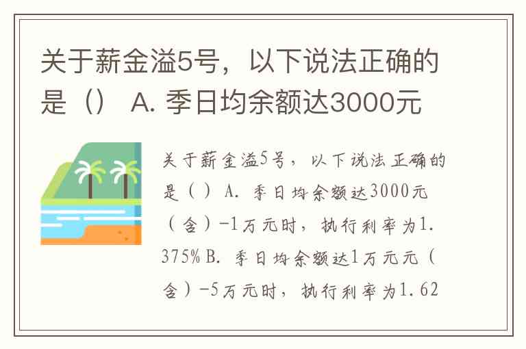 关于薪金溢5号,以下说法正确的是() A. 季日均余额达3000元(含)-1万元时,执行利率为1.375% B. 季日均余额达1万元元(含)-5万元时,执行利率为1.625% C. 季日均余额达5万元(含)-10万元时,执行利率为1.875% D. 季日均余额达10元(含)-20万元时,执行利率为2.625%