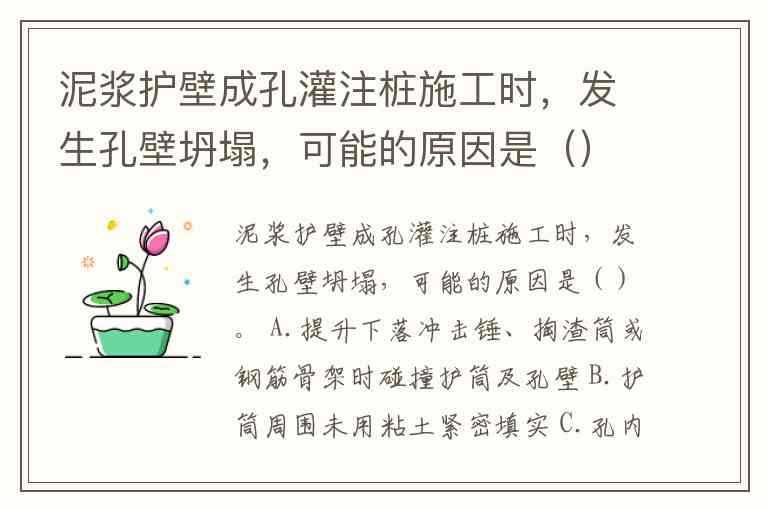 | D. 孔内水压降低等造成塌孔 | 此选项是C选项的另一种表述。孔内水压(即静水压力)的降低,通常就是由泥浆液面下降或泥浆比重过小造成的,其结果同样是破坏压力平衡。 |
