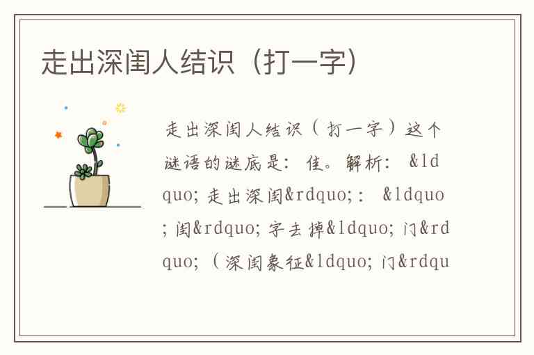 解析: “走出深闺”: “闺”字去掉“门”(深闺象征“门”),剩下 “圭”。