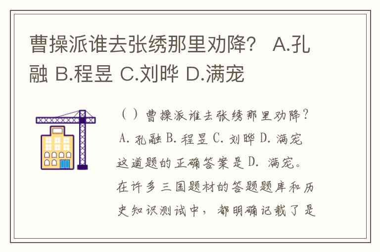 这道题的正确答案是 D. 满宠。在许多三国题材的答题题库和历史知识测试中,都明确记载了是满宠承担了这次劝降张绣的使命。