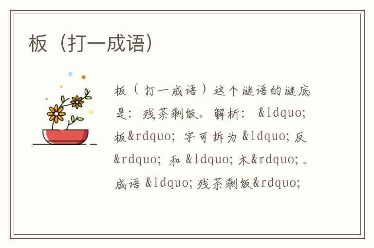 成语 “残茶剩饭” 本义是吃剩的茶饭,但此处通过字形联想: “反” 与“饭”谐音, “木” 与“茶”(茶树为木)相关, 组合后暗示“反木”即“饭茶”的残剩状态,形成双关。