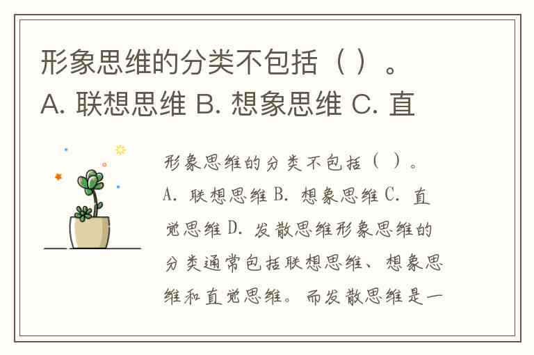 形象思维的分类不包括( )。 A. 联想思维 B. 想象思维 C. 直觉思维 D. 发散思维