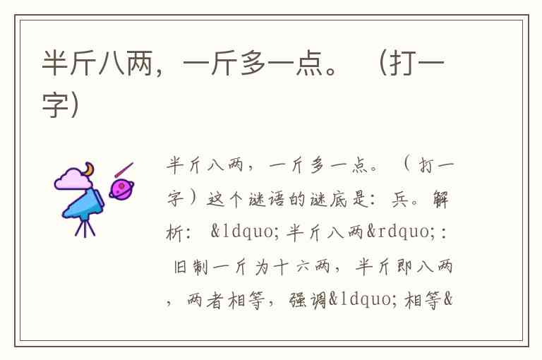 其实答案是 “兵”: “半斤八两” 会意“对称”,而“兵”字由“丘”和“八”组成(“丘”像对称结构,“八”像两点), “一斤多一点” 扣“兵”(“斤”+“丶”=“兵”?不通)。