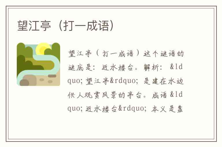 成语 “近水楼台” 本义是靠近水边的楼台先得到月光,比喻因近便而获得优先机会,与“望江亭”临水而建的特点完全契合。
