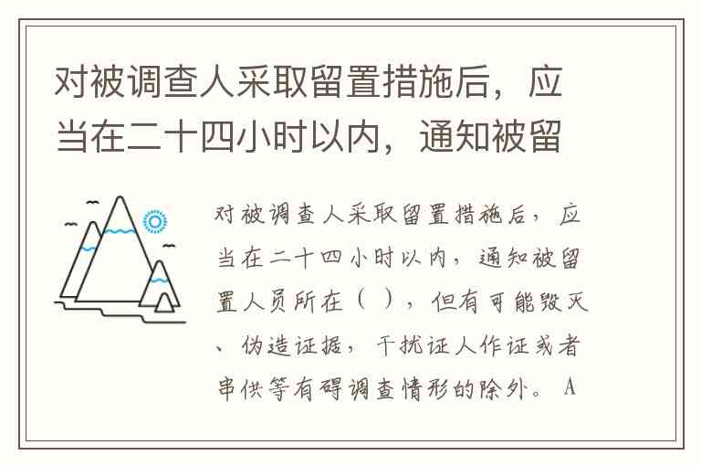 对被调查人采取留置措施后,应当在二十四小时以内,通知被留置人员所在( ),但有可能毁灭、伪造证据,干扰证人作证或者串供等有碍调查情形的除外。 A. 单位和家属 B. 家属 C. 近亲属 D. 单位