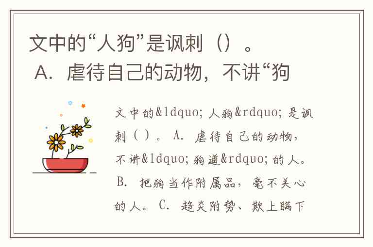 文中的“人狗”是讽刺()。 A.虐待自己的动物,不讲“狗道”的人。 B.把狗当作附属品,毫不关心的人。 C.趋炎附势、欺上瞒下、恃强凌弱的人。 D.生活没有陌生感、没有挑战性。 A. (四)阅读文章,完成下列5题。 B. 我是一只老狗,已到苟延残喘之年,即将离开这个世界。可是,在这个时刻,我想把我一生中悟出的道理讲出来,希望于狗和人的后代们有益。当然,这是狗的道理。 C. 我从很小的时候——也就是还不懂事的时候起,就跟随着主人。我曾经以为,他是大狗的形态,而我是小狗的形态,我长大以后会变成他那个样子。等到长大了以后才明白,我与他不是同类,我是狗,而他是人,我生下来就是要听他的命令、为他服务的。 D. ①主人不仅对我很好,而且也很尊重我,从来不打我,甚至从未呵斥过我。主人给一点好处,我就兴高采烈,感激不尽,在主人面前摇头摆尾。②作为一只狗,理应感到满足了,因为有些狗的主人极其恶劣,会虐待他的狗。然而,无论主人多么好,这都不是狗本来的生活。③狗本来应该是风餐露宿,驰骋于山野之间;狗应该是爱情的战士,撕杀于爱情的角斗场,周旋于诸位漂亮的母狗之中;狗应该是权力的斗士,与其他公狗逐鹿中原。而我们狗,过的是一种什么样的生活啊!饱食终日,无所用心,除了用餐,就是睡觉,不睡觉的时候也是一副昏昏欲睡的样子,因为没有什么东西能够激发起我的精神,连个说话的狗也没有;我每天周旋于这几十米的领地上,对于这院子里的一草一木都已经熟悉得不能再熟悉了,生活在这样一个没有陌生感、没有挑战性的世界里有什么意思!这样一只狗活着究竟有什么意义呢 E. 我终于明白,我们狗只不过是主人的一件附属品,正像他的一件衣服是附属品一样,当主人死了,我们狗也就被抛弃在一边;或者,当我死后,马上就会有另一只更年轻的狗来代替我。我开始重新审视我的主人。从前我曾经是如此喜欢、尊重的这个主人,现在我已经非常瞧不起他;④从前他在我心目中是那样威严不可侵犯,现在我却觉得他还不如一只狗! 他的秘密我是再清楚不过了。他陷害朋友,可是当着那个朋友的面却表现得如此忠诚!他在别的女人面前像一只发情的公狗,但回到家里却装成一头老老实实的骡子! F. 其实,人类中也有狗,我把他们称之为“人狗”。他们趋炎附势,欺上瞒下,专干恃强凌弱的勾当;在主人面前他们表现得如此忠顺——那一副奴才相让我们这些狗看了都感到脸红,可是他们在内心里却窥视着主人的位子,有多少人死在他们的奴才手里!人类把这样的人叫做“狗”,我看他们还不如狗,把他们叫做狗实在是抬举了他们,也是对我们狗的侮辱,因为我们狗对于主人从来都是忠诚的,他们这些人怎么能与我们狗类相提并论呢他们不配狗的名称,我们才是真正的狗,而他们不过是披着狗皮的人罢了。 G. 人有人道,兽有兽道,兽道的不一定是人道的,但人道的也不一定是兽道的,所以人没有权利用人道来代替兽道。人有人权,狗有狗权,人权不应该代替狗权。这些观点,如果非要用一个什么“主义”来称谓的话,那么,就仿照“人道主义”的说法,称之为“狗道主义”吧。 H. (摘自严春友《狗道主义》,原载《出版广角》2004年第12期)