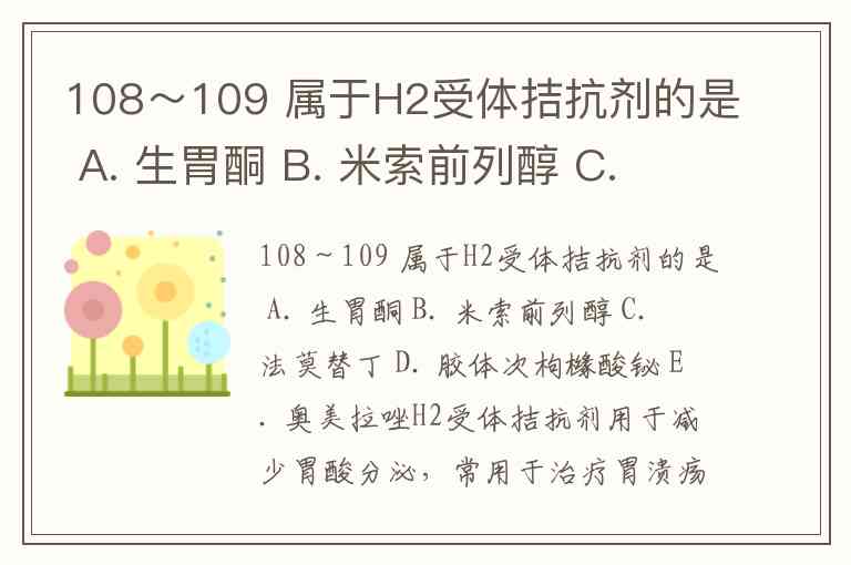 108~109 属于H2受体拮抗剂的是 A. 生胃酮 B. 米索前列醇 C. 法莫替丁 D. 胶体次枸橼酸铋 E. 奥美拉唑