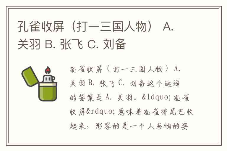 “孔雀收屏”意味着孔雀将尾巴收起来,形容的是一个人或物的姿态。这里的“收屏”可以理解为收起尾巴的意思,寓意着威严与冷静,而关羽在三国中的形象正是威武、沉稳和冷静的。因此,谜底是关羽。