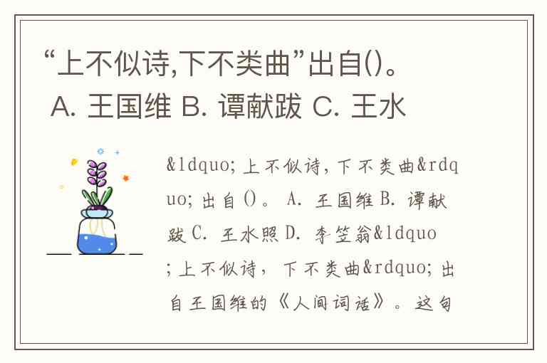 “上不似诗,下不类曲”出自()。 A. 王国维 B. 谭献跋 C. 王水照 D. 李笠翁