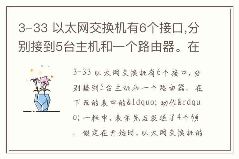 3-33 以太网交换机有6个接口,分别接到5台主机和一个路由器。在下面的表中的“动作”一栏中,表示先后发送了4个帧。假定在开始时,以太网交换机的交换表是空的。试把该表中的其他的栏目都填写完。
