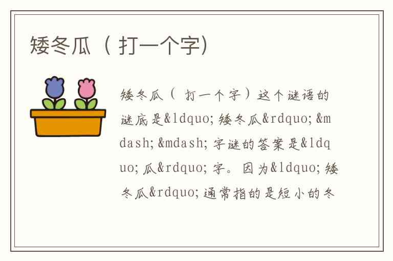这个谜语的谜底是“矮冬瓜”——字谜的答案是“瓜”字。因为“矮冬瓜”通常指的是短小的冬瓜,而字谜常用字形或字义来表示意思。在这个谜语里,“瓜”字形象地代表了“冬瓜”,而“矮”暗示它的短小形态。所以答案就是“瓜”字。