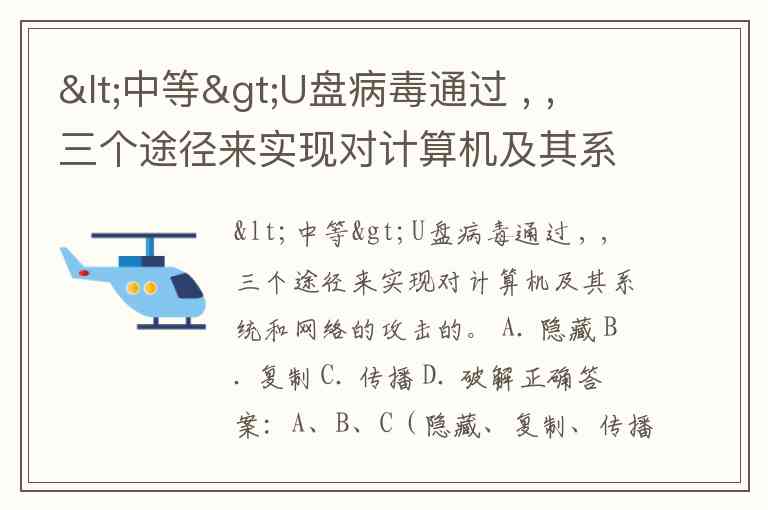 <中等>U盘病毒通过 , , 三个途径来实现对计算机及其系统和网络的攻击的。 A. 隐藏 B. 复制 C. 传播 D. 破解