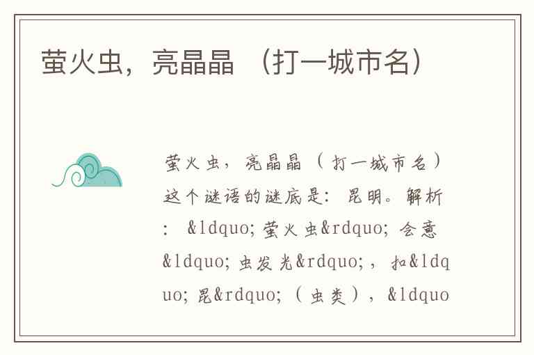 解析: “萤火虫” 会意“虫发光”,扣“昆”(虫类),“亮晶晶”扣“明”(明亮)。