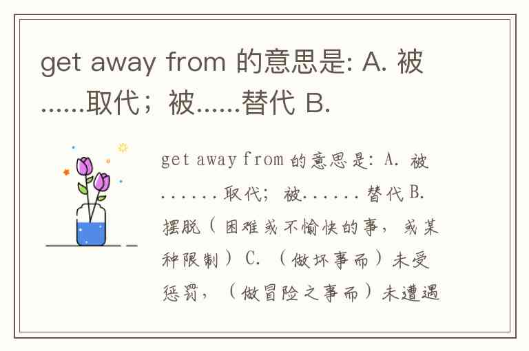get away from 的意思是: A. 被......取代;被......替代 B. 摆脱(困难或不愉快的事,或某种限制) C. (做坏事而)未受惩罚,(做冒险之事而)未遭遇不测 D. 学生从(学校)逃出,水兵从(船里)逃出,放弃(主义等)