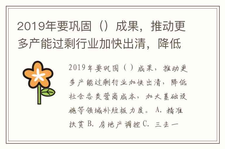 2019年要巩固()成果,推动更多产能过剩行业加快出清,降低社会各类营商成本,加大基础设施等领域补短板力度。 A. 精准扶贫 B. 房地产调控 C. 三去一降一补