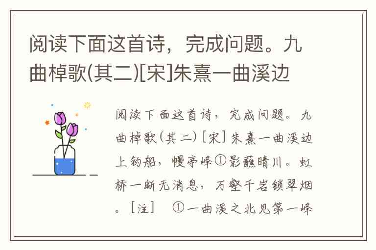 A. 正确。诗题为“九曲棹歌”,提到“九曲溪”,所以这条溪流共分为九处曲折。诗歌的第一句提到“一曲溪边上钓船”,说明作者是在九曲溪的第一曲处上船,符合此推断。