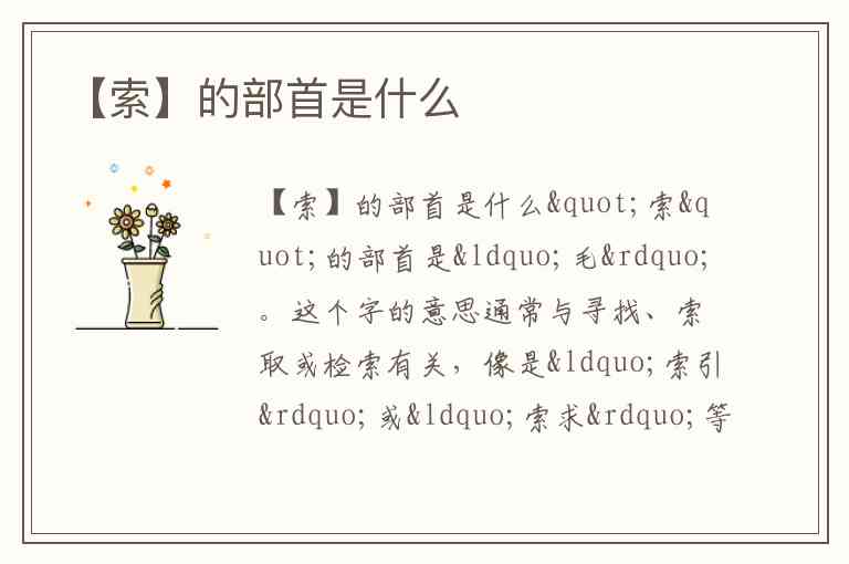"索"的部首是“毛”。这个字的意思通常与寻找、索取或检索有关,像是“索引”或“索求”等词语中都会使用这个字。
