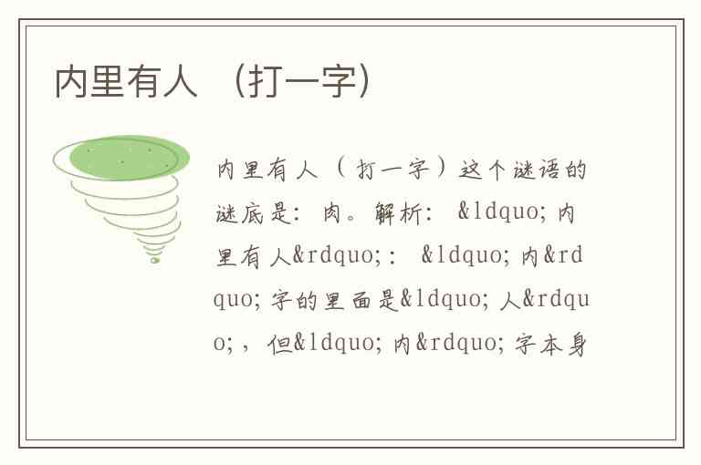 解析: “内里有人”: “内”字的里面是“人”,但“内”字本身是“冂”+“人”,若“有人”则直接是“内”,但谜底不是“内”。