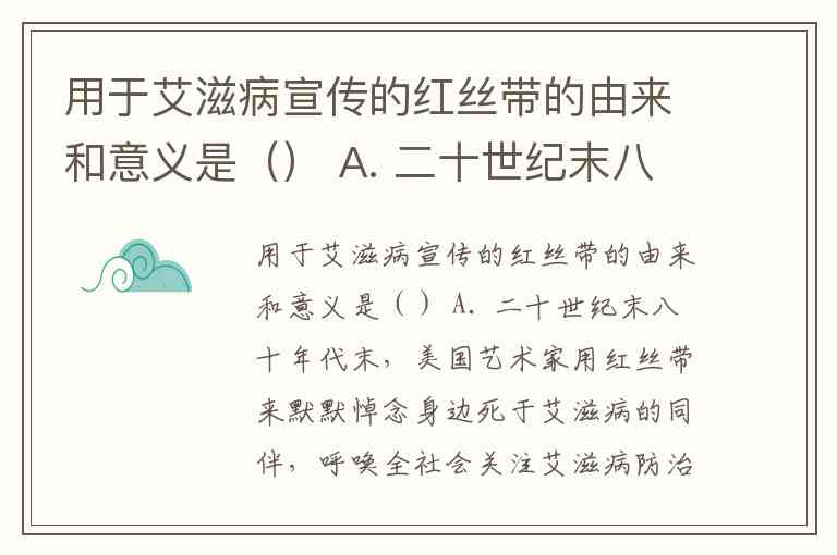 解释:红丝带的由来与1980年代末美国艺术家对艾滋病患者的纪念有关。艺术家通过佩戴红丝带来悼念因艾滋病去世的朋友,并引起社会对艾滋病防治的关注。这个标志不仅象征对艾滋病患者的支持和关爱,还代表了全球对艾滋病预防、治疗的共同努力。因此,红丝带后来成为了全球理解和关爱艾滋病毒感染者及艾滋病人的国际标志。