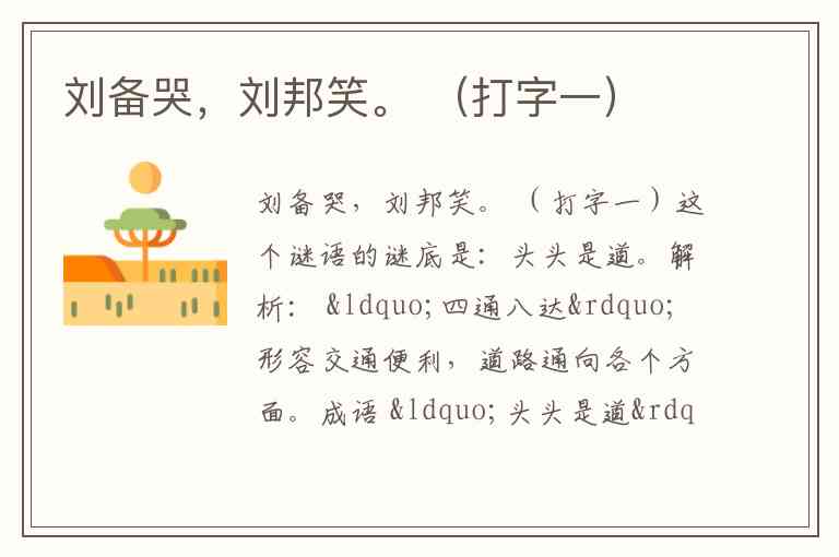 刘备哭:刘备,字玄德,是蜀汉的开国君主。这里的“刘备”借指“蜀”字或“蜀国”。“哭”意味着死亡、逝去。所以“刘备哭”可以理解为“蜀”字没有了、失去了。在汉字中,“卒”有死亡、结束的意思。因此,“刘备哭”可以扣“蜀卒”,即“蜀”字失去了“卒”。