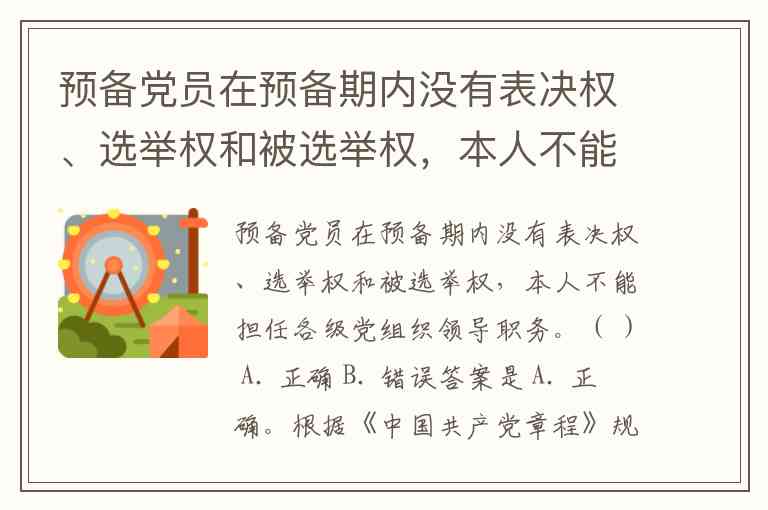 预备党员在预备期内没有表决权、选举权和被选举权,本人不能担任各级党组织领导职务。( ) A. 正确 B. 错误